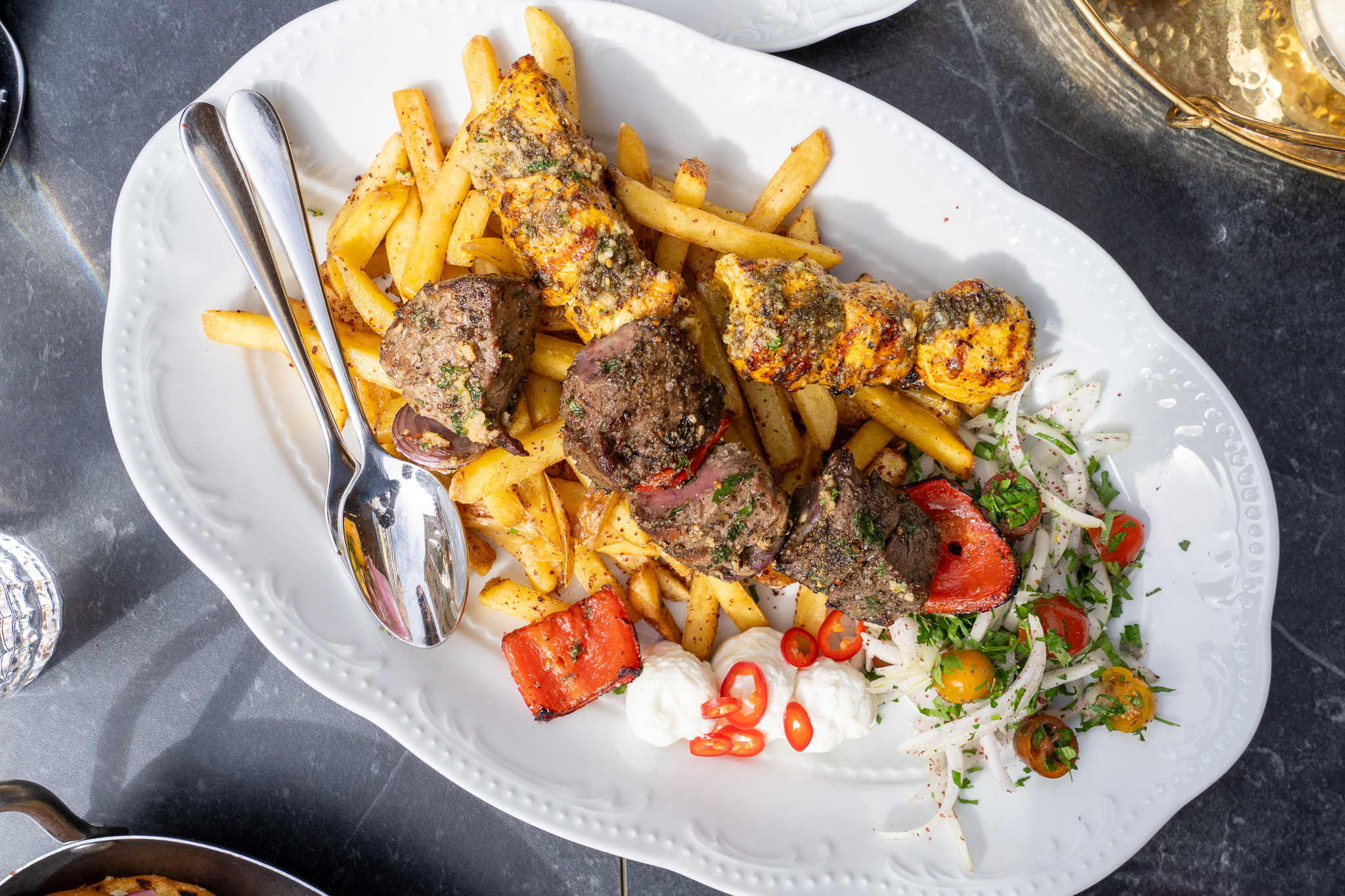 valinnan mukaan sitruuna-valkosipuliperunat tai zaatar-raskalaiset.